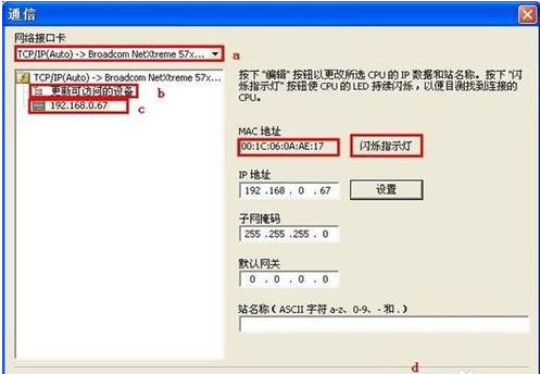 然后,進行如下操作:a.單擊 “網(wǎng)絡(luò)接口卡” 下拉列表選擇編程設(shè)備的 “網(wǎng)絡(luò)接口卡”。 b. 雙擊 “更新可用設(shè)備” 來刷新網(wǎng)絡(luò)中存在的 CPU ; c. 在設(shè)備列表中跟據(jù) CPU 的 IP 地址選擇已連接的 CPU。 d. 選擇需要進行下載的 CPU 的 IP 地址之后,單擊 “OK” 按鈕,建立連接。(同時只能選擇一個 CPU 與Micro/WIN SMART 進行通信)注意:如果網(wǎng)絡(luò)中存在不只一臺設(shè)備,用戶可以在 “通信” 對話框中左側(cè)的設(shè)備列表中選中某臺設(shè)備然后點擊 “Flash Lights” 按鈕輪流點亮 CPU 本體上的 RUN ,STOP 和 ERROR 燈來辨識該 CPU。 也可以通過 “MAC地址” 來確定網(wǎng)絡(luò)中的 CPU, MAC 地址在 CPU 本體上 “LINK” 指示燈的上方。
